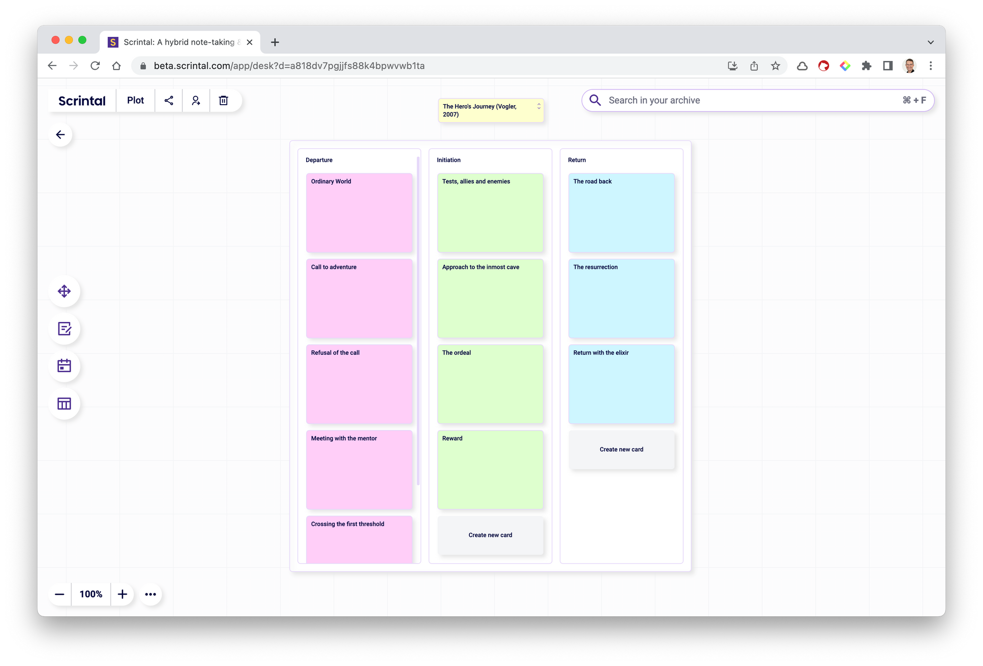 All your work so far is stored in your archive. You may like to make several new boards to explore different plots, story developments or interactions between characters. This is a low-friction way to test different scenarios without messing up your current work. You are constructing new and different views with the same data. Be as creative as you like, and discard things that don’t work.