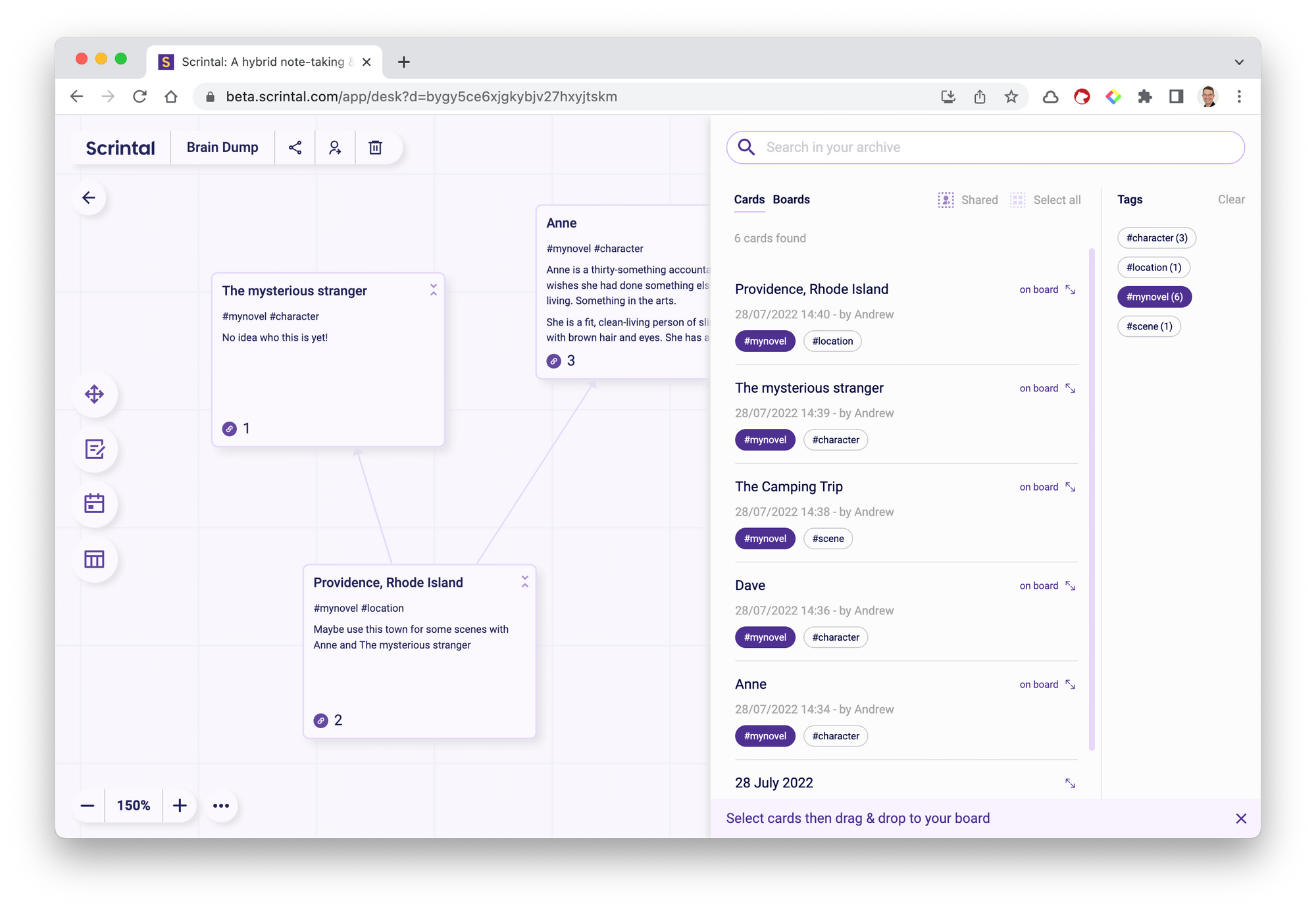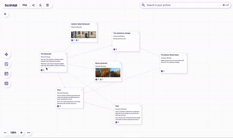 Create a new Scrintal board to use as a brain dump, and just start putting cards in it as things come to mind. You may start with an idea for a character or a part of a storyline. Or even a sudden insight about a completely different project. The brain-dumping process isn’t a single event. Keep the board and use it as a scratch pad for anything that comes to mind.