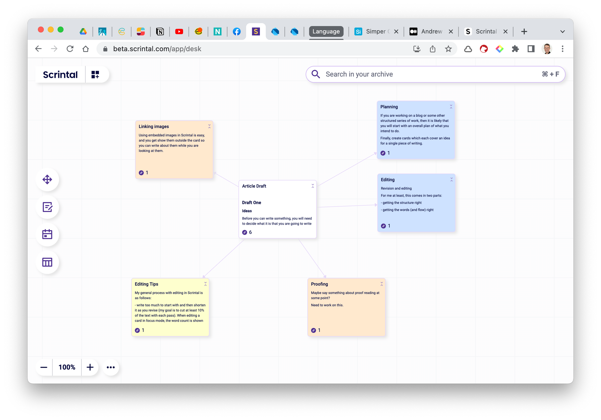 As we have seen, Scrintal can help with the whole lifecycle of writing an article, from planning, idea management, editing and review.