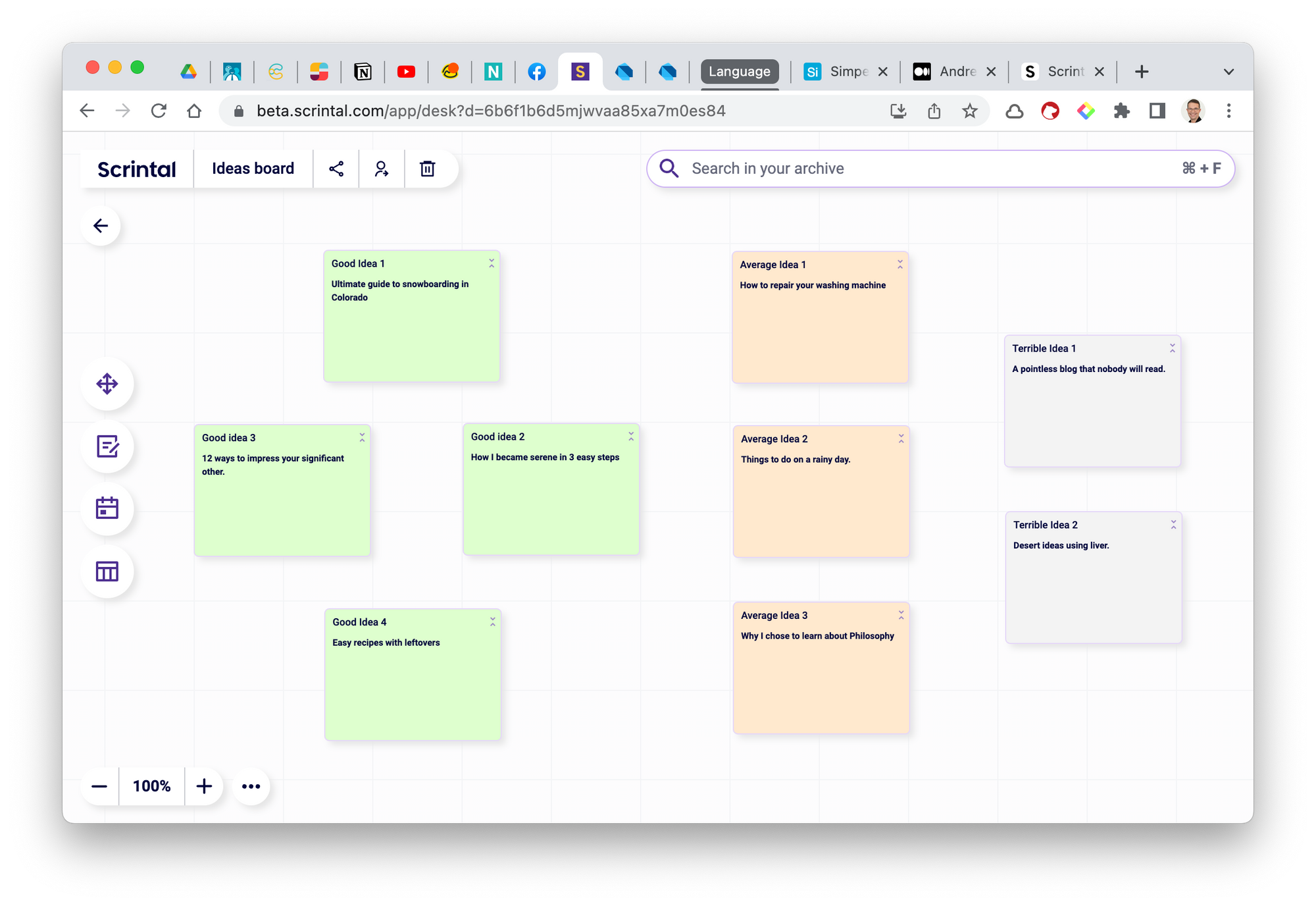 Your opinion of your ideas might grow or diminish over time. Therefore it’s good to review them a few times to decide whether they are looking better or sounding worse. I like to use colours here in Scrintal, but you may prefer to use clusters of cards (one cluster for good ideas, one for questionable ones etc.). Or you could use a Scrintal table with columns for each category of idea.