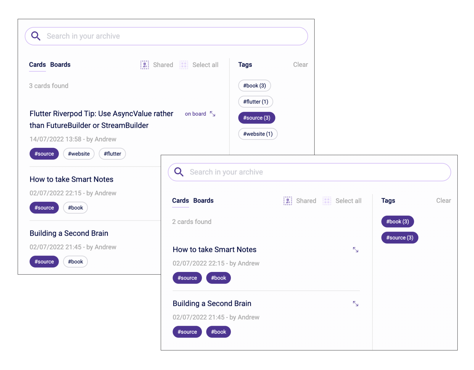 You might use tags; for example, #linguistics, #questions, #todo. If you click on a tag in Scrintal’s archive, you see a subset of tags for cards that already have the first tag. This allows you to rapidly show a subset of cards from a larger set.