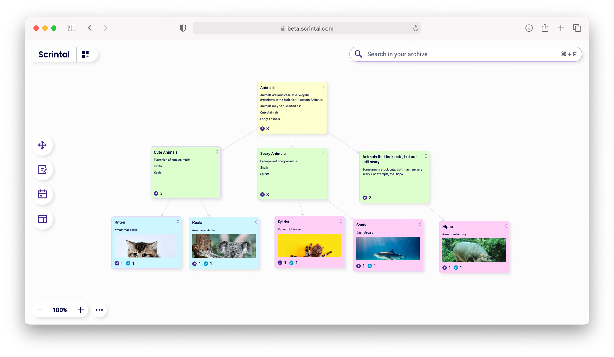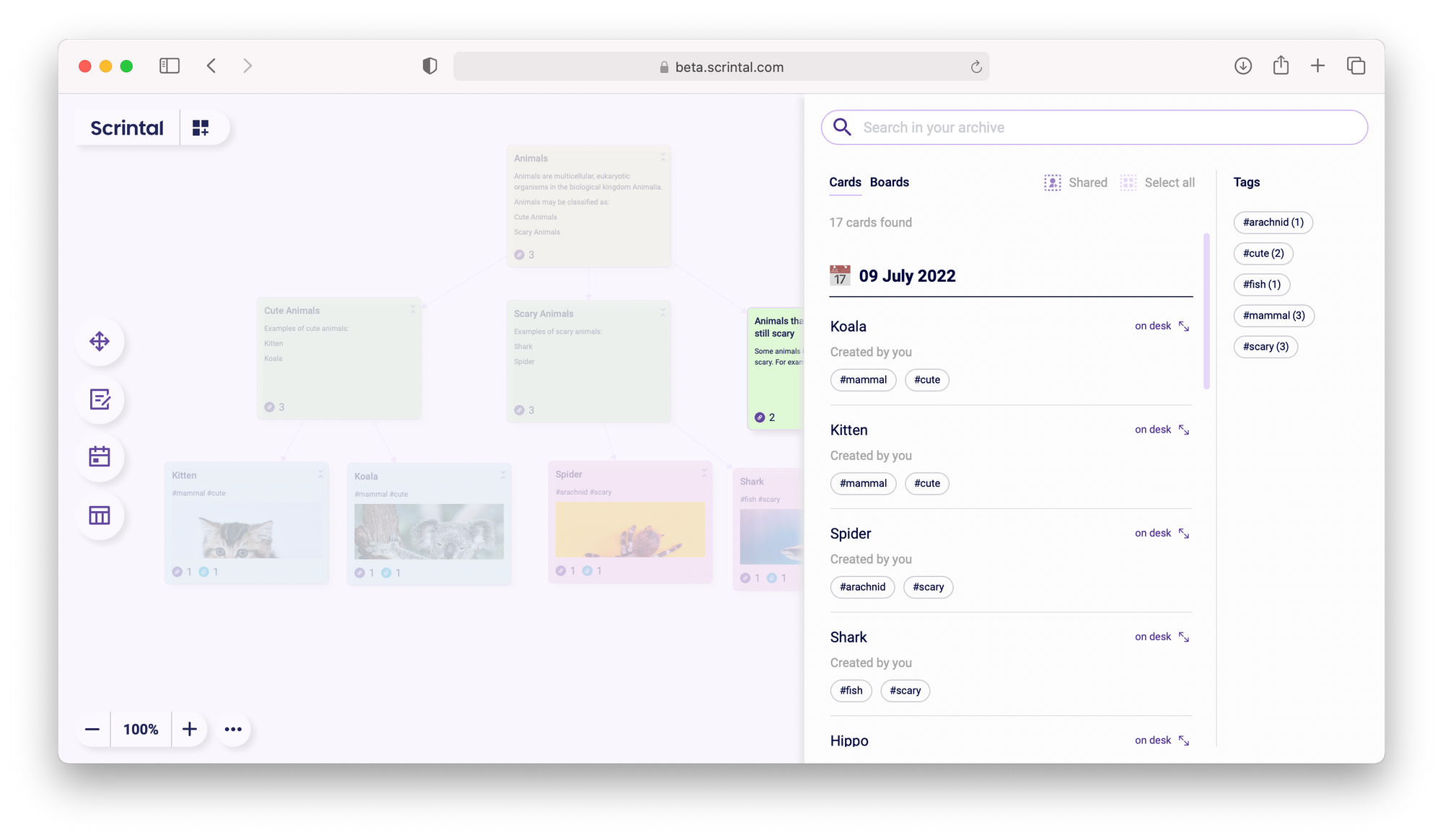 The fundamental units of work in Scrintal are Cards. Cards are resizable documents in which you write (with formatted text) and place objects like videos, PDFs and other files. Cards can have one or more tags attached to them, which is helpful for searching, categorising or attaching status and additional information. You can link to other cards and see backlinks from cards and related cards (i.e. links to cards that share a tag). Traversing these links is easy to navigate.