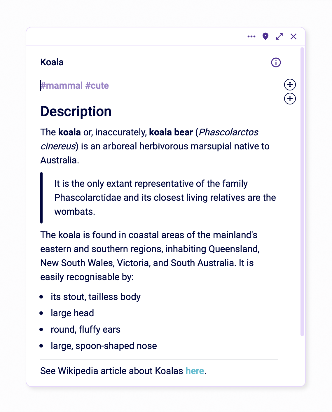 Scrintal has tags available for cards. These can be used in various ways to suit users’ needs, and you can find cards based on their tags. For example, you can have tags for different categories of cards (#person, #reference) or to show status (#todo, #done).